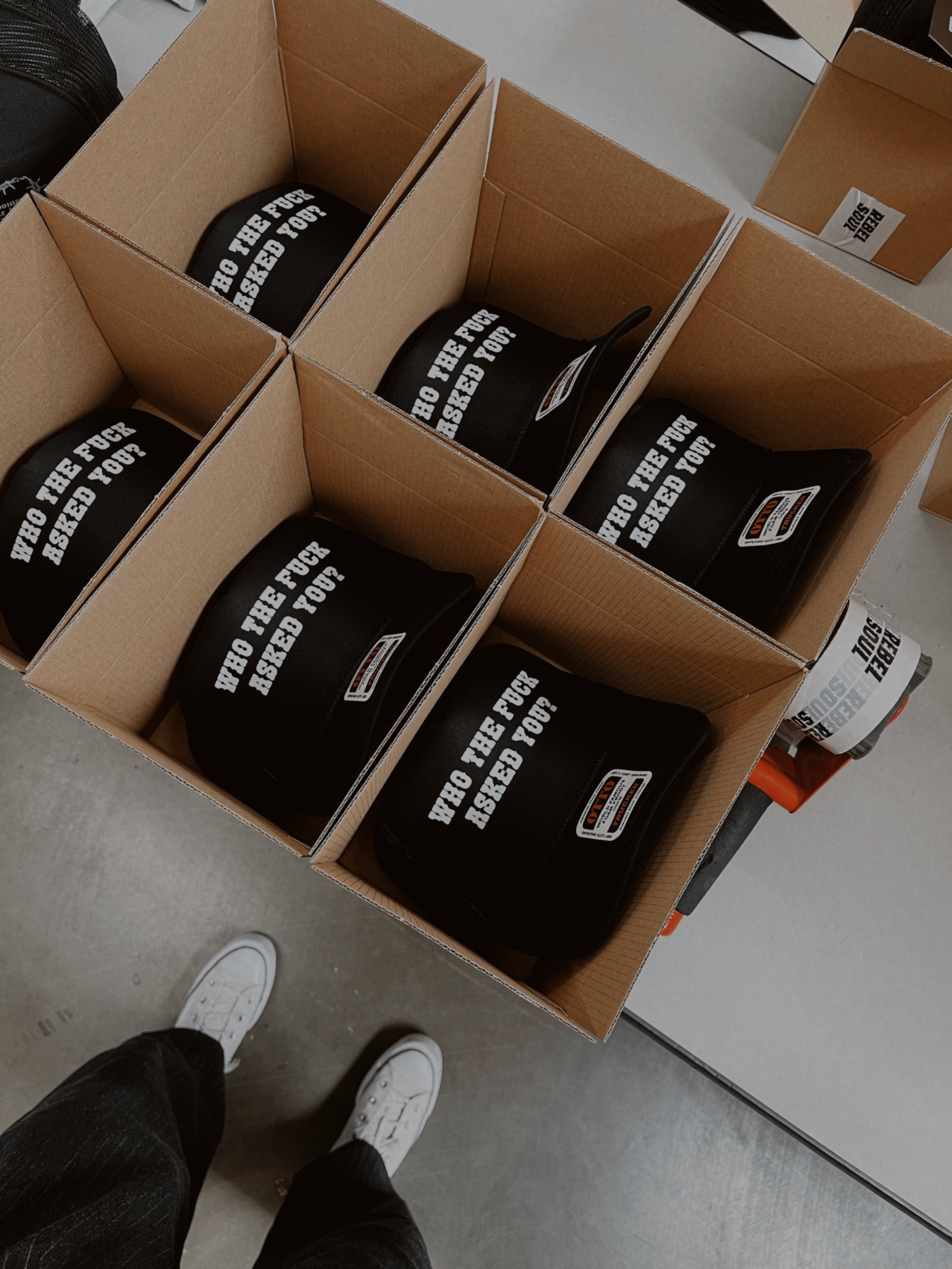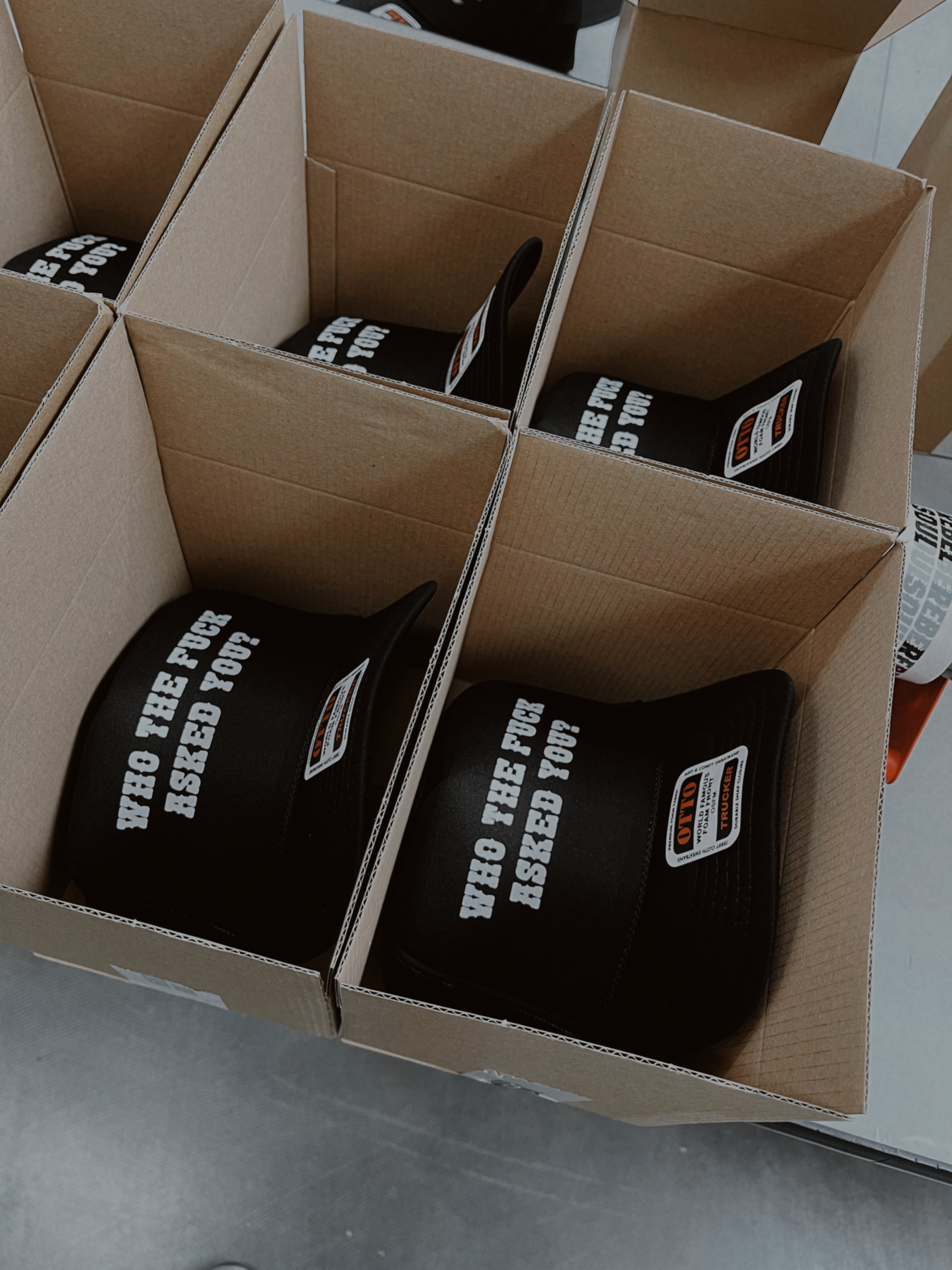 These are structured and high-profile foam trucker hats with "Who The Fuck Asked You?" printed directly onto the front